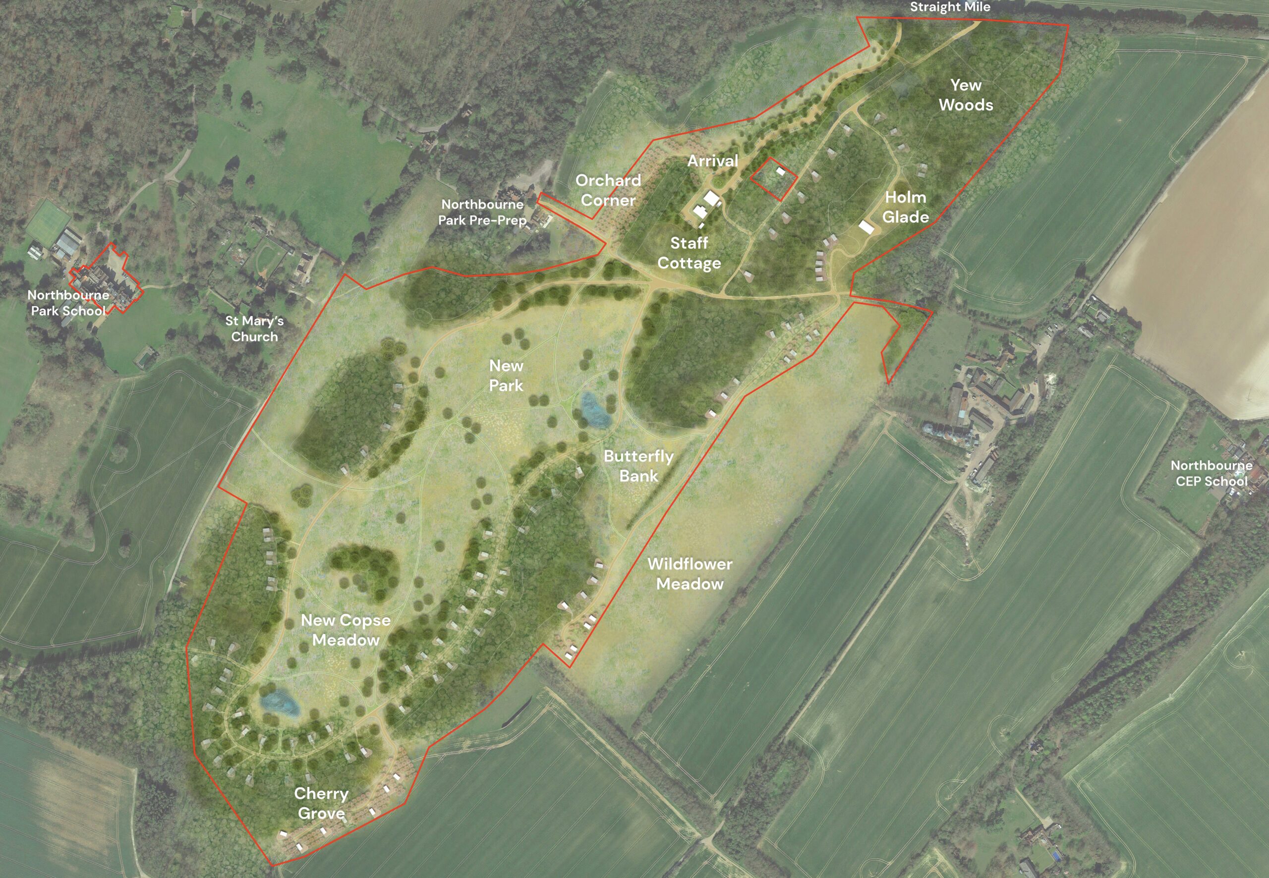 Welcome to our dedicated consultation website, showcasing proposals for a nature retreat featuring circa. 96 cabins on land at New Park, Northbourne, shown in red below. This project builds on the heritage and character of the Northbourne Estate.
